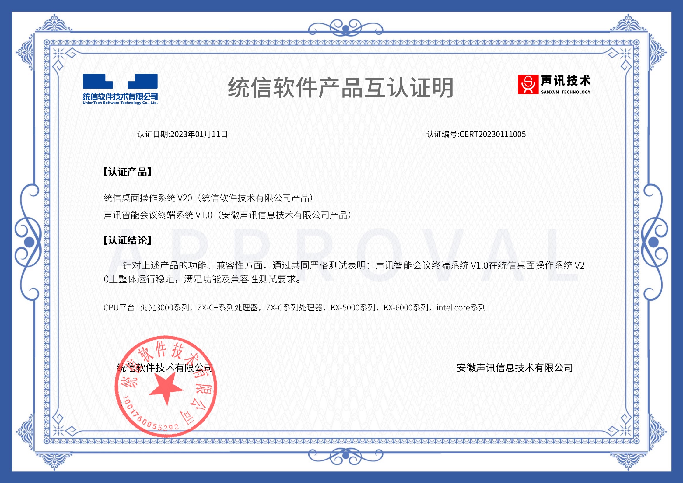 瀏覽 ![]() 聲訊智能會議管理系統(tǒng)V1.0與統(tǒng)信桌面操作系統(tǒng)V20適配認證 瀏覽 ![]() 聲訊智能會議管理系統(tǒng)V1.0 與統(tǒng)信桌面操作系統(tǒng)V20適配認證 瀏覽 ![]() 聲訊智能會議終端系統(tǒng) V1.0與統(tǒng)信桌面操作系統(tǒng)V20適配認證 瀏覽 ![]() 聲訊智能會議管理系統(tǒng)V1.0與統(tǒng)信桌面操作系統(tǒng)V20適配認證 瀏覽 ![]() 聲訊智能會議管理系統(tǒng)V1.0與 統(tǒng)信桌面操作系統(tǒng)V20 適配認證 瀏覽 ![]() 聲訊智能會議終端系統(tǒng) V1.0 與統(tǒng)信桌面操作系統(tǒng)V20適配認證 瀏覽 ![]() 2022年度合肥高新區(qū)雛鷹企業(yè) 瀏覽 ![]() 無線數(shù)據(jù)終端3c認證 瀏覽 ![]() 網(wǎng)絡(luò)電視機頂盒3c認證中文 瀏覽 ![]() 聲訊語音速記本軟件評測證書 瀏覽 ![]() 聲訊智能機頂盒軟件v1.0軟件測試證書 瀏覽 ![]() 聲訊聽說AI語音飛鼠軟件V1.0軟件測試證書 瀏覽
