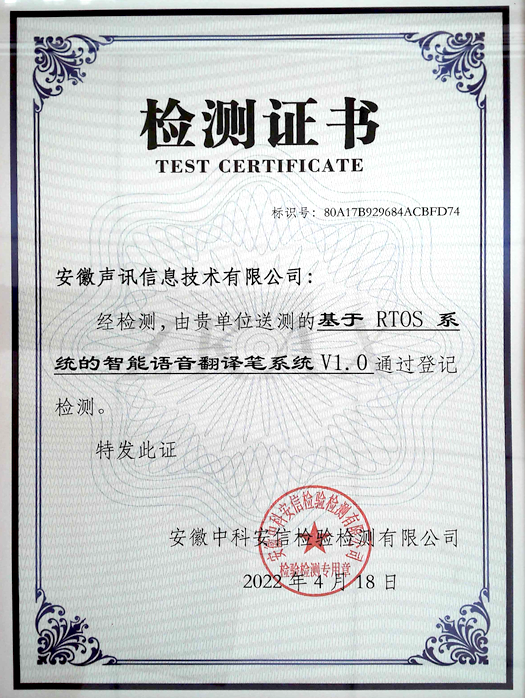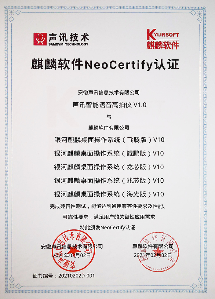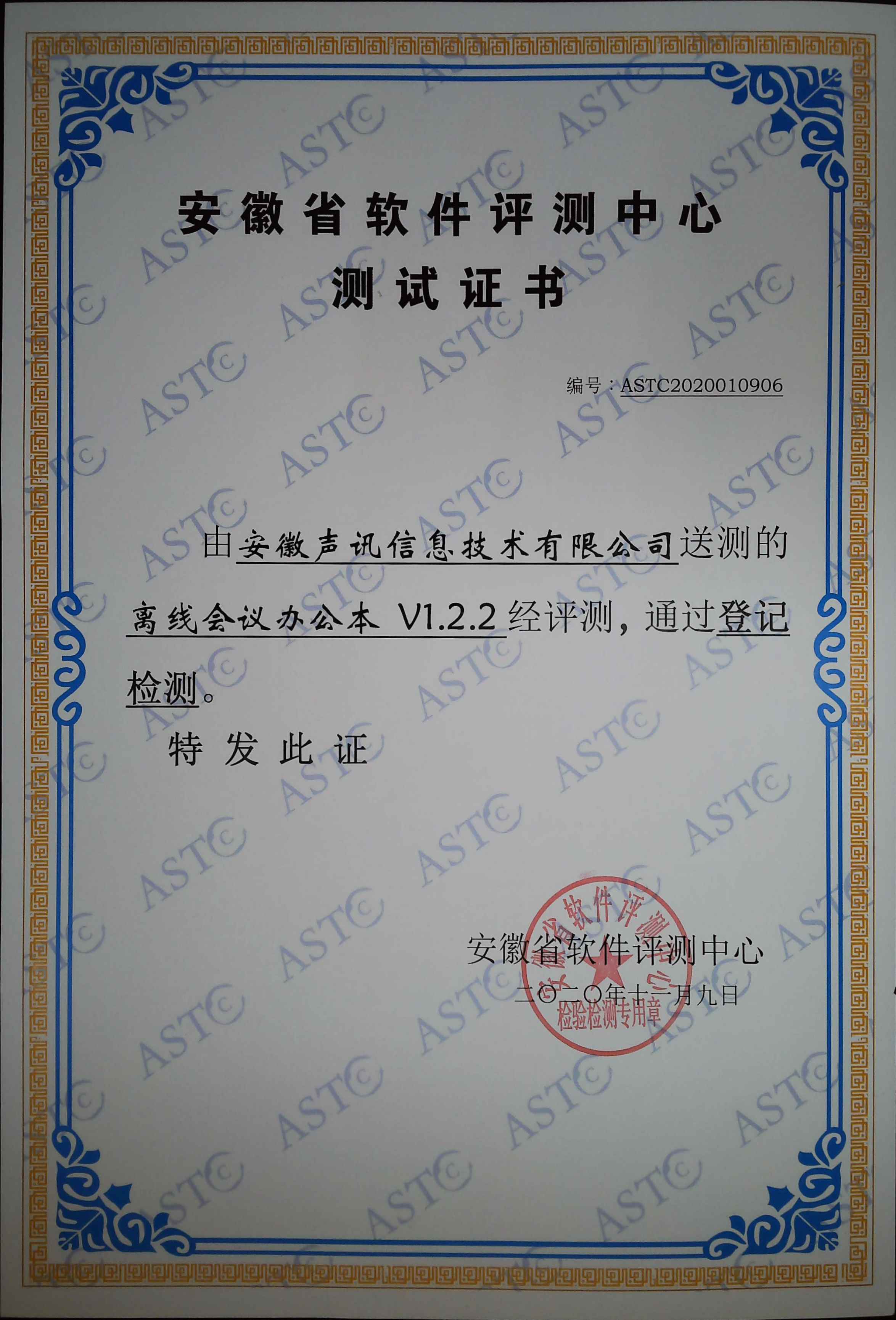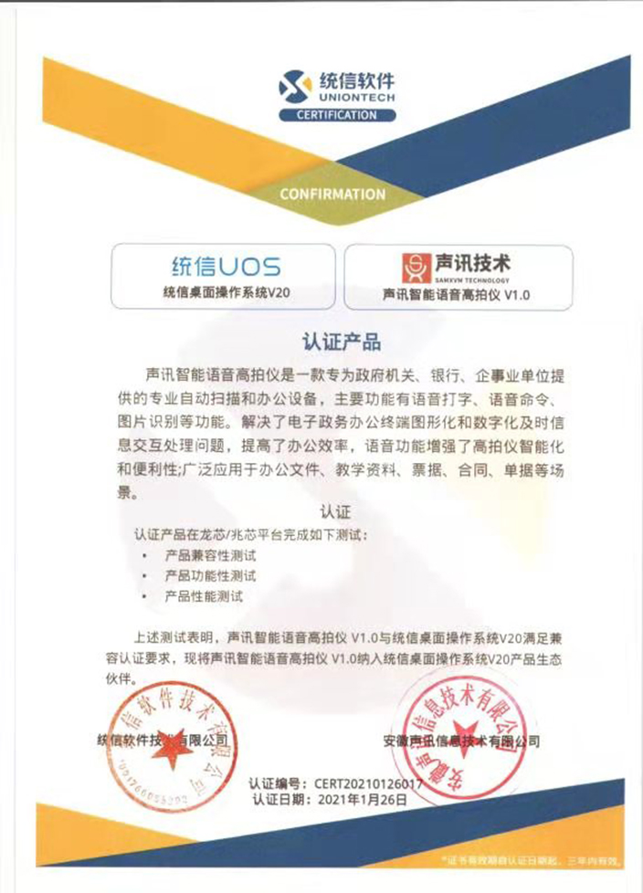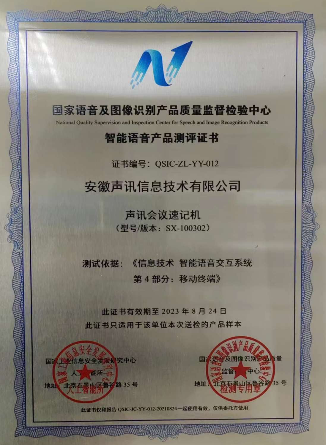 瀏覽 ![]() 軟件產(chǎn)品登記測試報告聲訊智能無紙化會議軟件V1.0 瀏覽 ![]() 聲訊語音速記本軟件軟件產(chǎn)品測試報告 瀏覽 ![]() 離線會議辦公本V1.2.2安徽省軟件評測中心測試證書 瀏覽 ![]() 離線會議辦公本軟件產(chǎn)品登記檢測報告 瀏覽 ![]() 聲訊會議速記機檢測報告 瀏覽 ![]() 智能會議系統(tǒng)V1.0鑒定檢測報告 瀏覽 ![]() 智能語音產(chǎn)品測評證書聲訊會議速記機(型號/版本:SX-100302) 瀏覽 ![]() 聲訊智能語音高拍儀產(chǎn)品V1.0在龍芯3A4000平臺兼容認證 瀏覽 ![]() 基于圖像和語音識別的課本指讀學(xué)習(xí)機系統(tǒng)V1. 0檢測證書 瀏覽 ![]() 基于RTOS系統(tǒng)的智能語音翻譯筆系統(tǒng)V1.0檢測證書 瀏覽 ![]() 20210126聲訊智能語音高拍儀與龍芯兆芯認證統(tǒng)信軟件認證產(chǎn)品 瀏覽 ![]() 20210202聲訊智能語音高拍儀V1.0與麒麟軟件兼容認證 瀏覽