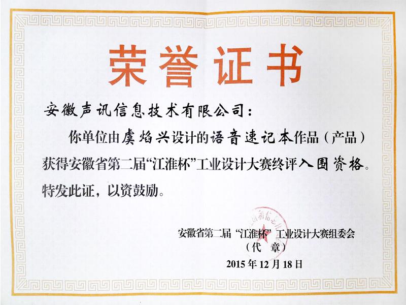 聲訊語音速記本榮獲安徽省第二屆“江淮杯”工業(yè)設(shè)計大賽入圍資格20151218