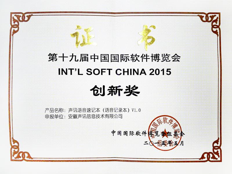 《聲訊語音速記本》榮獲第十九屆中國國際軟件博覽會創(chuàng)新獎201505
