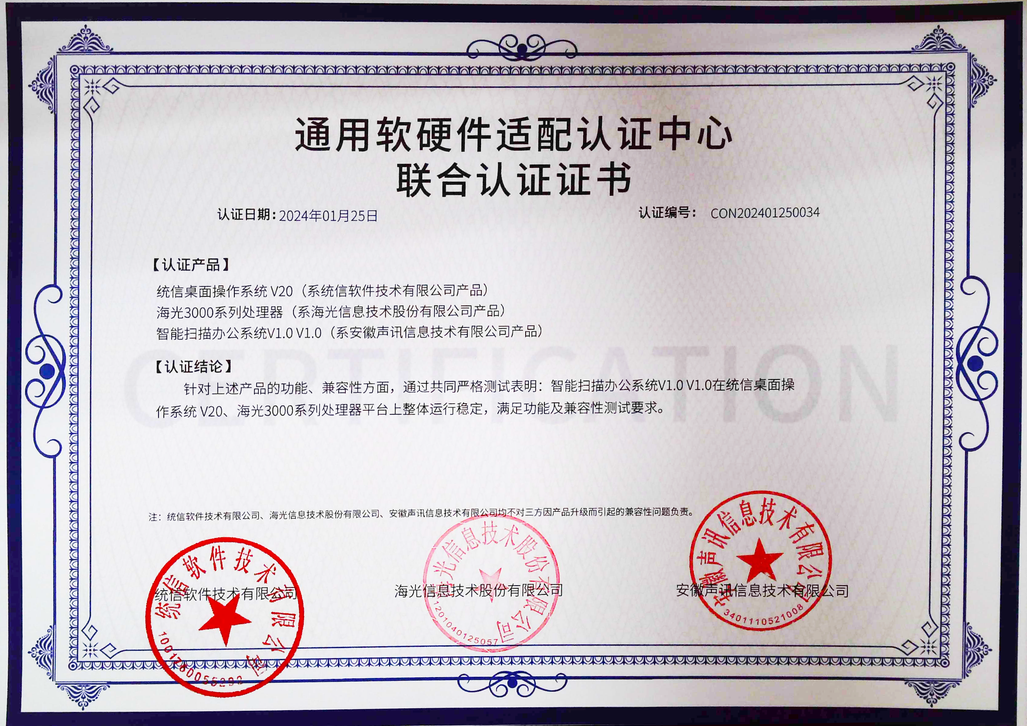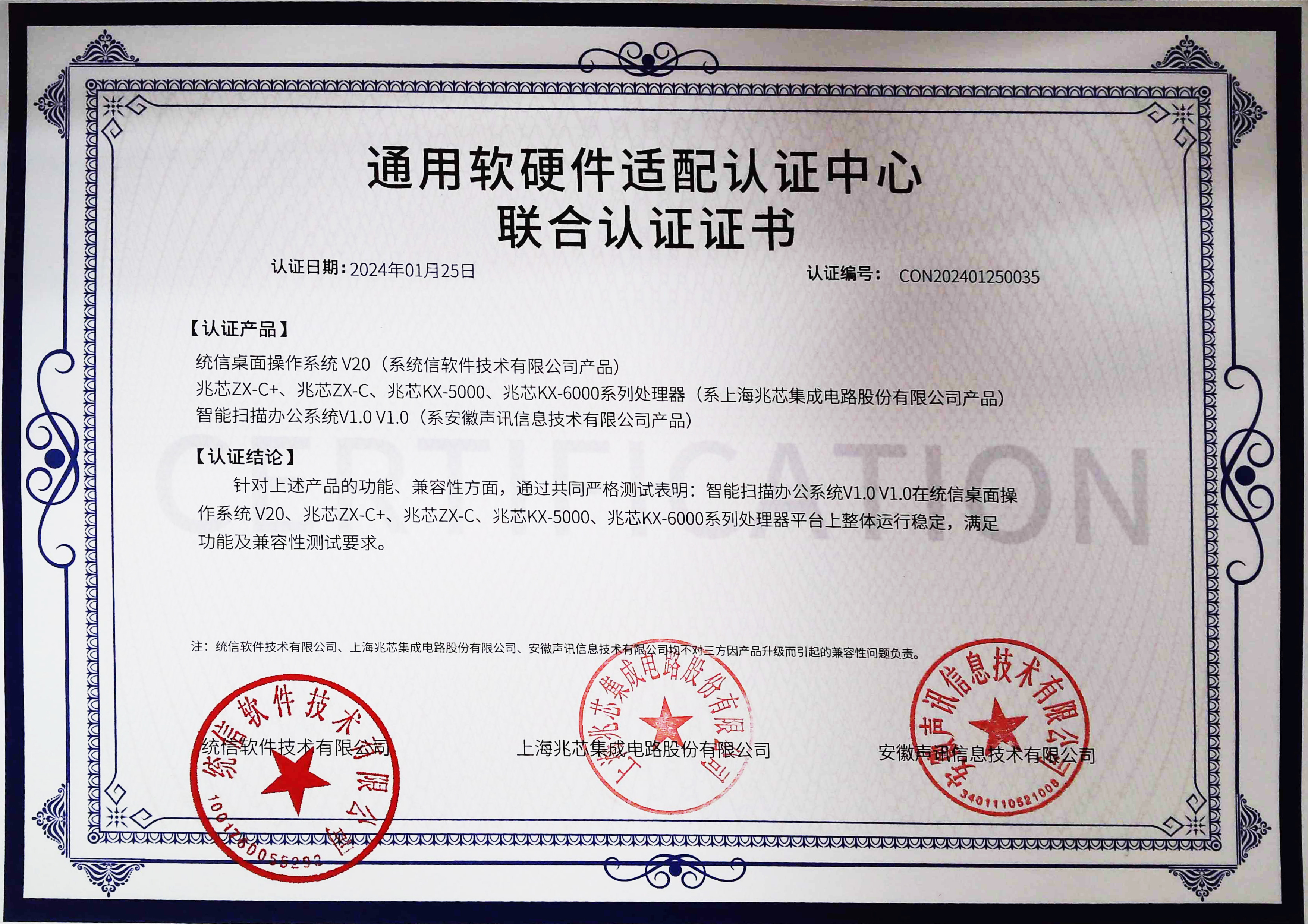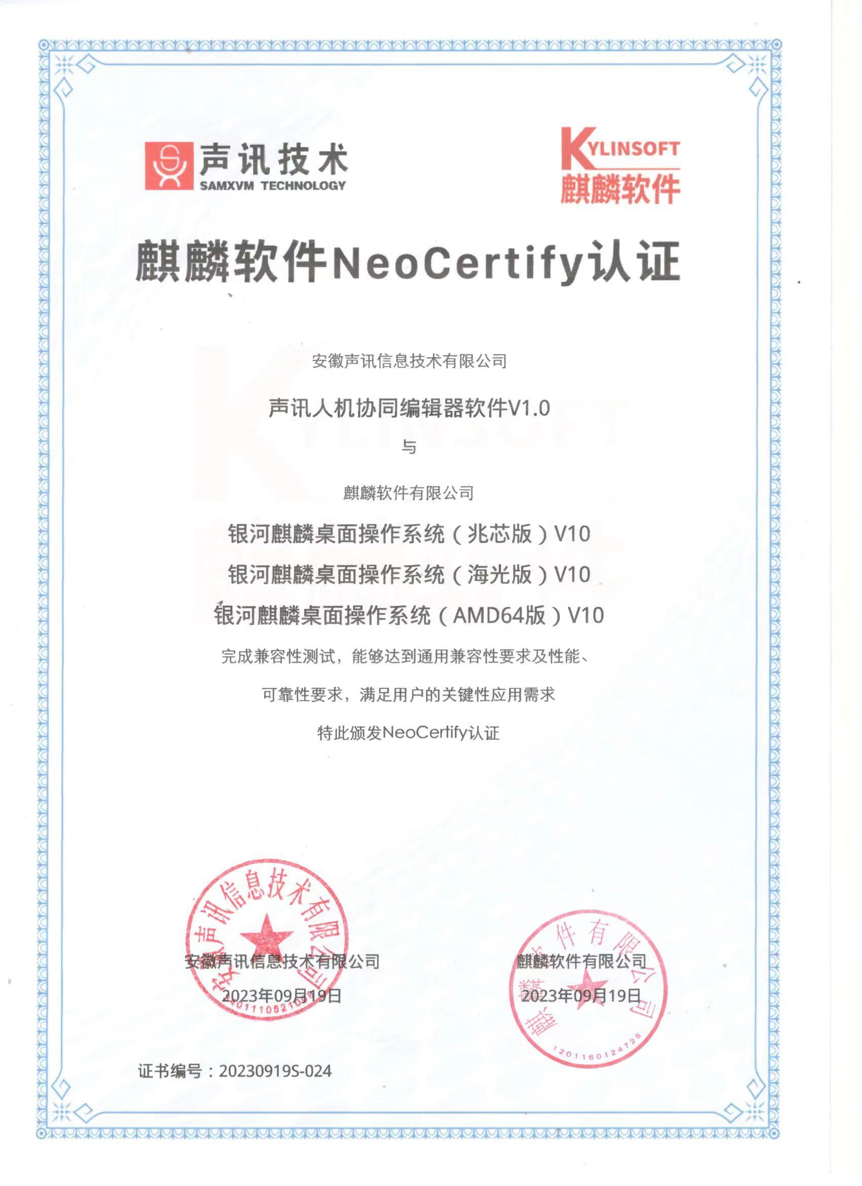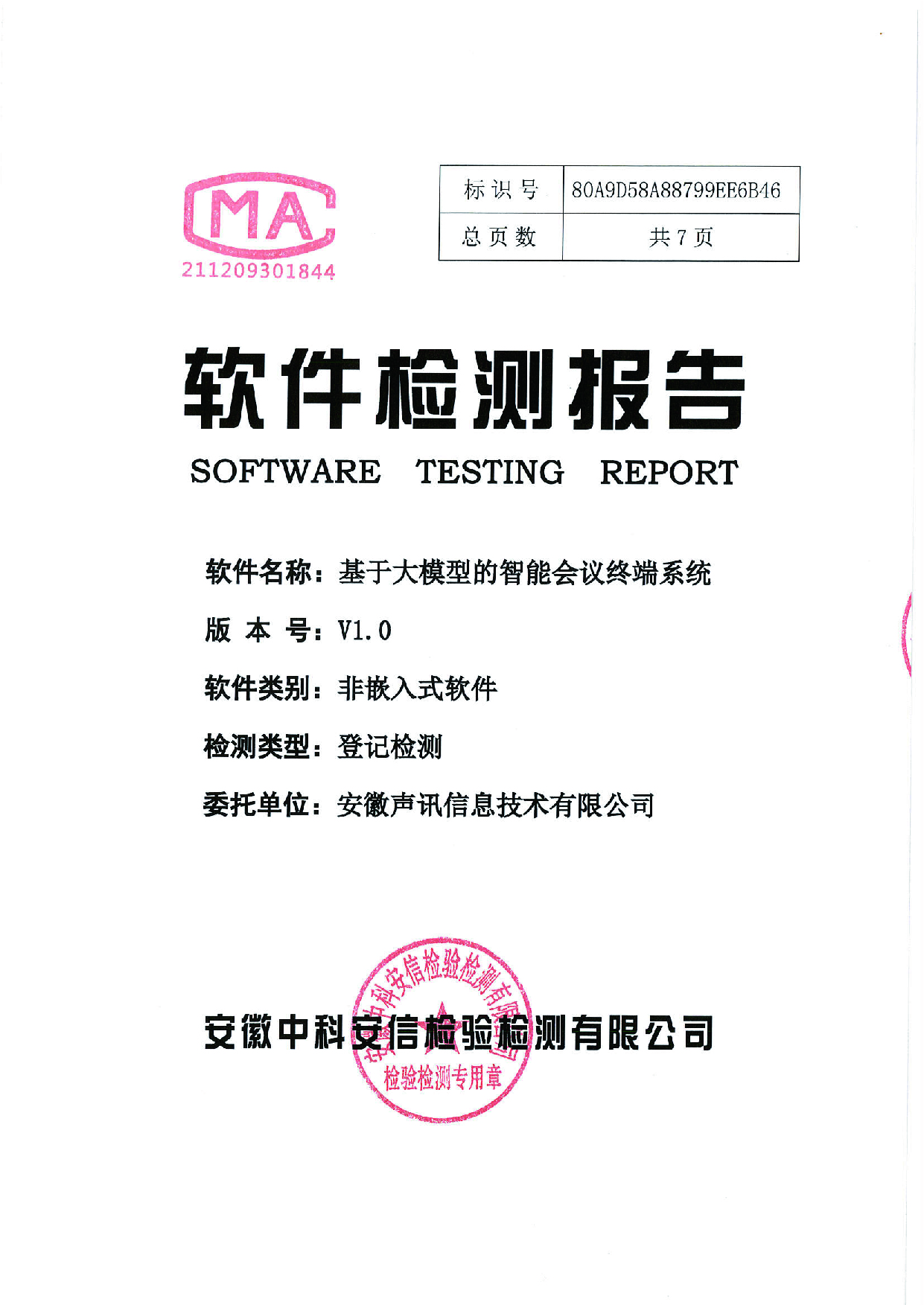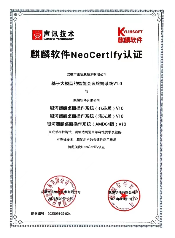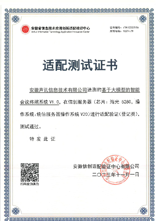 瀏覽 ![]() 聲訊智能掃描辦公系統(tǒng)V1.0V1.0與統(tǒng)信桌面操作系統(tǒng)v20、海光3000系列處理器適配認(rèn)證 瀏覽 ![]() 聲訊智能掃描辦公系統(tǒng)v1.0v1.0與統(tǒng)信桌面操作系統(tǒng)v20、兆芯ZX-C+、兆芯ZX-C、兆芯KX-5000、兆芯KX-6000適配認(rèn)證 瀏覽 ![]() 智能化接口檢測設(shè)備系統(tǒng) 瀏覽 ![]() 智能掃描辦公系統(tǒng) 瀏覽 ![]() 基于大模型的智能會議終端系統(tǒng)V1.0查新報告 瀏覽 ![]() 基于大模型的智能會議終端系統(tǒng)V1.0適配測試證書 瀏覽 ![]() 基于大模型的智能會議終端系統(tǒng)V1.0軟件檢測報告 瀏覽 ![]() 基于大模型的智能會議終端系統(tǒng)V1.0檢測證書 瀏覽 ![]() 基于大模型的智能會議終端系統(tǒng)V1.0與麒麟軟件NeoCertify適配認(rèn)證 瀏覽 ![]() 智能物聯(lián)網(wǎng)會議麥克風(fēng)安全檢測報告 瀏覽 ![]() 聲訊人機協(xié)同編輯器軟件V1.0與麒麟軟件NeoCertify適配認(rèn)證 瀏覽 ![]() 聲訊智能物聯(lián)網(wǎng)麥克風(fēng)查新報告 瀏覽